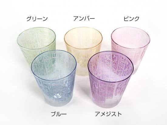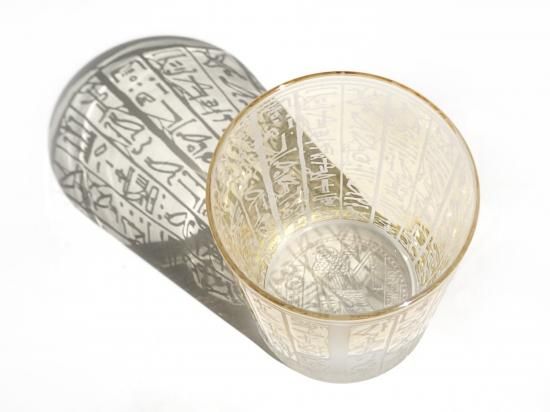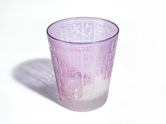 シャボングラスと呼ばれるグラスに、古代エジプトの象形文字(ヒエログリフ)を彫刻した作品です。