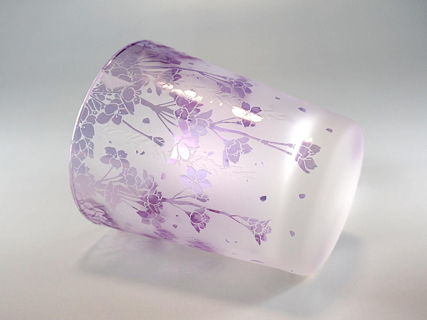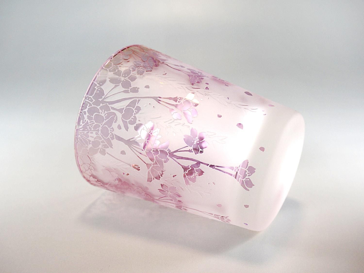 淡い色彩と光沢が特徴のシャボングラスに、枝垂れ桜と柳の枝葉をサンドブラスト彫刻したグラスです。