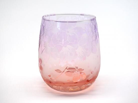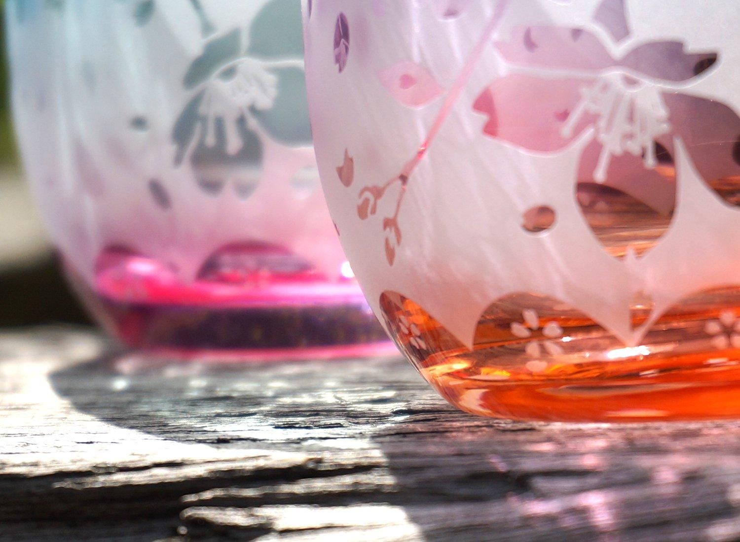 丸っこい形が特徴のロックグラスに、満開の桜と舞い散る花びらを彫刻しました。
