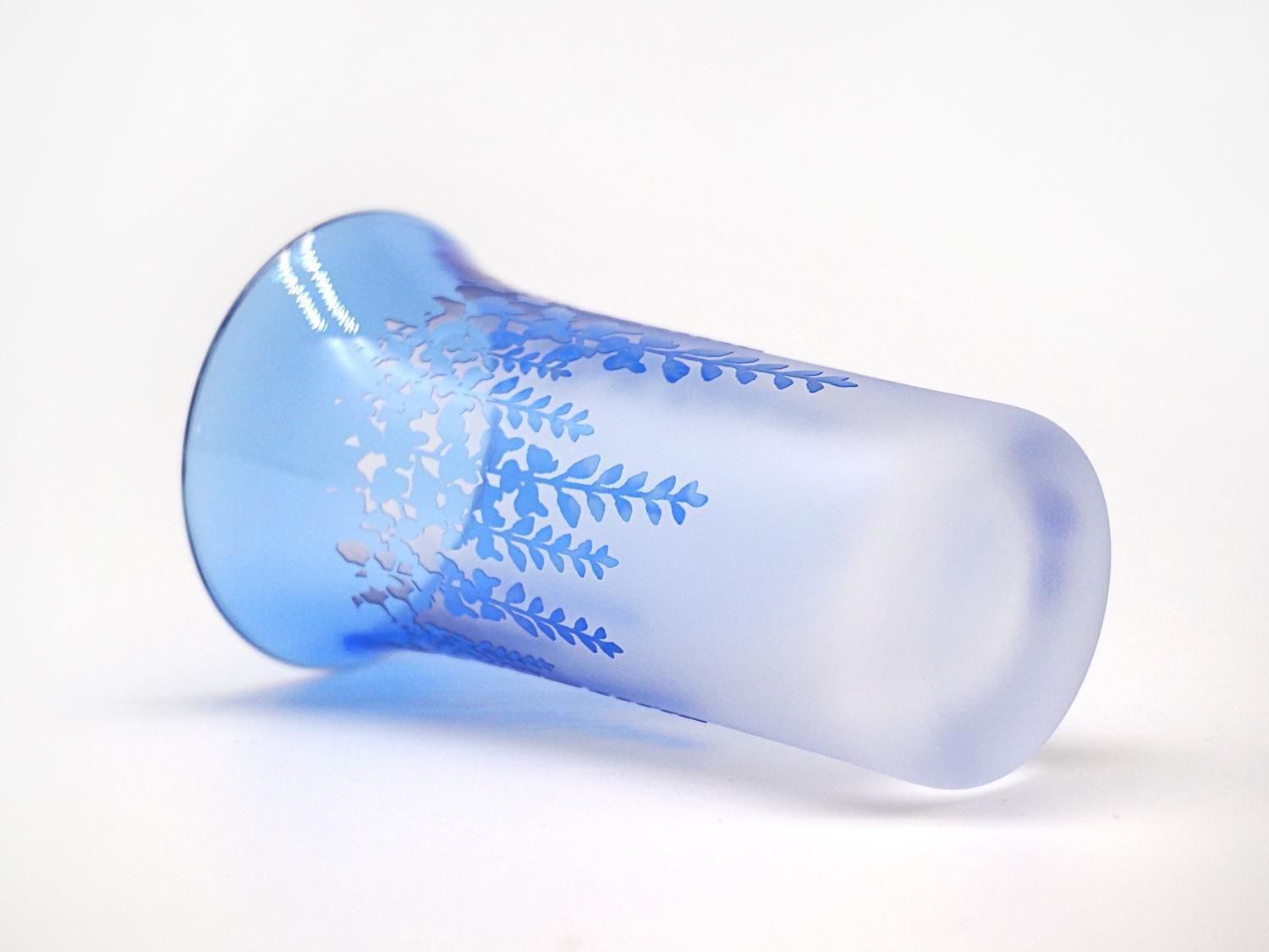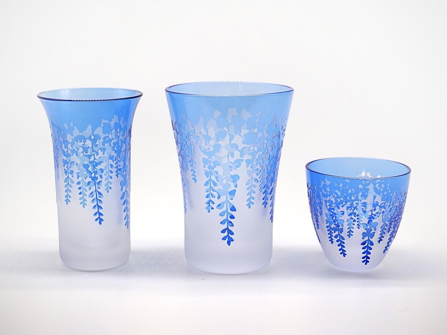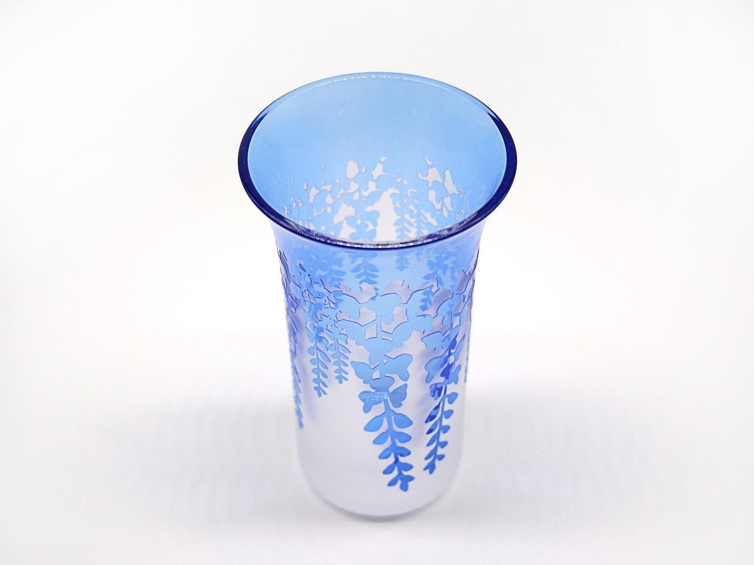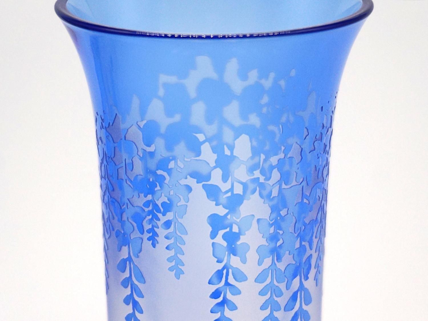 切子などにも使用される国産の被せガラスに、藤の花を彫刻しました。ギャラリー内で取り扱っている夕藤・若藤と同じモチーフになります。