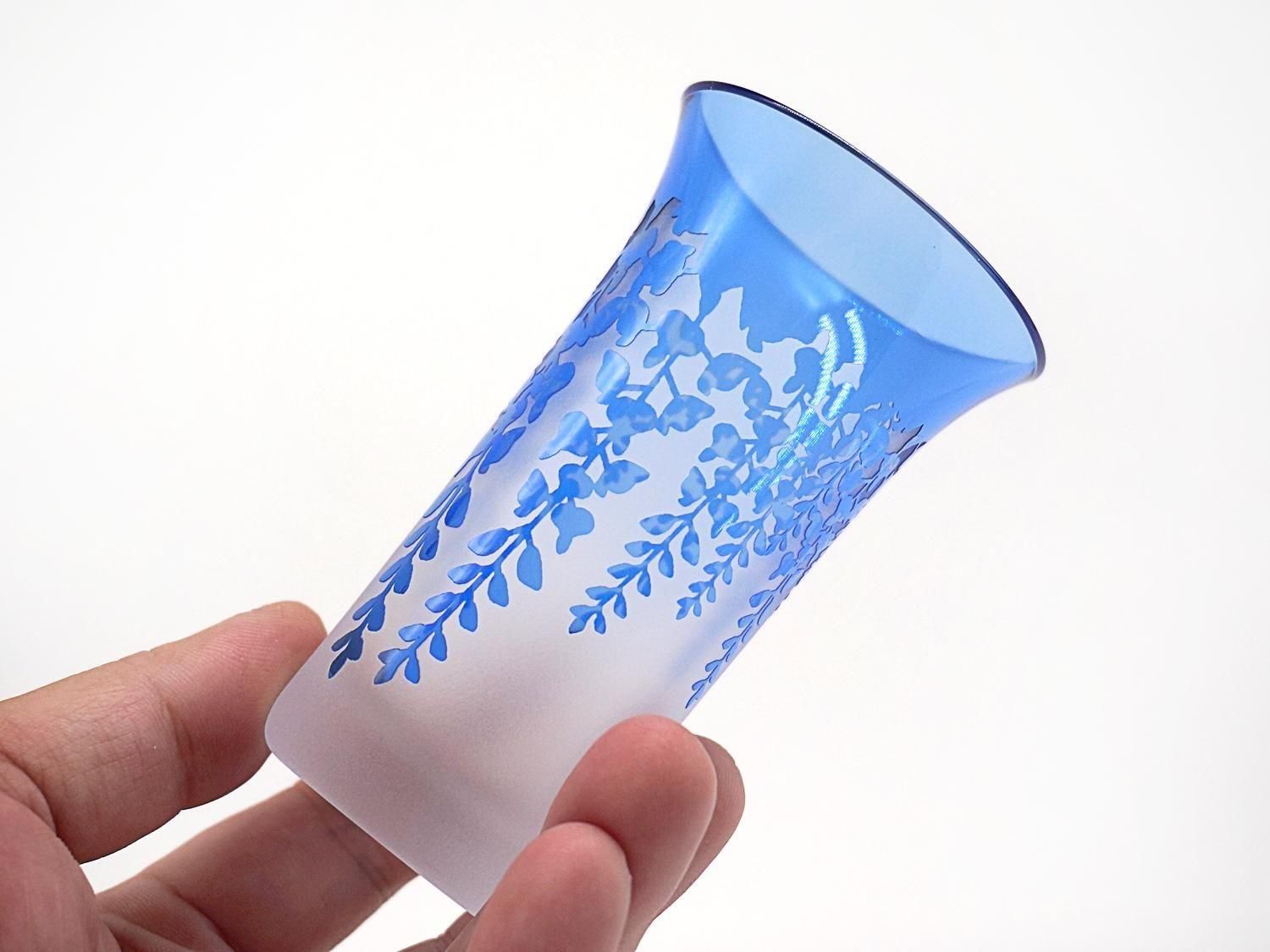 飲み物を注ぐと、内側の藤が揺らいでとても風流です。水・焼酎・日本酒・ワインなどをこのグラスでいただけば、いつもよりちょっとだけ美味しくなるかもしれません。